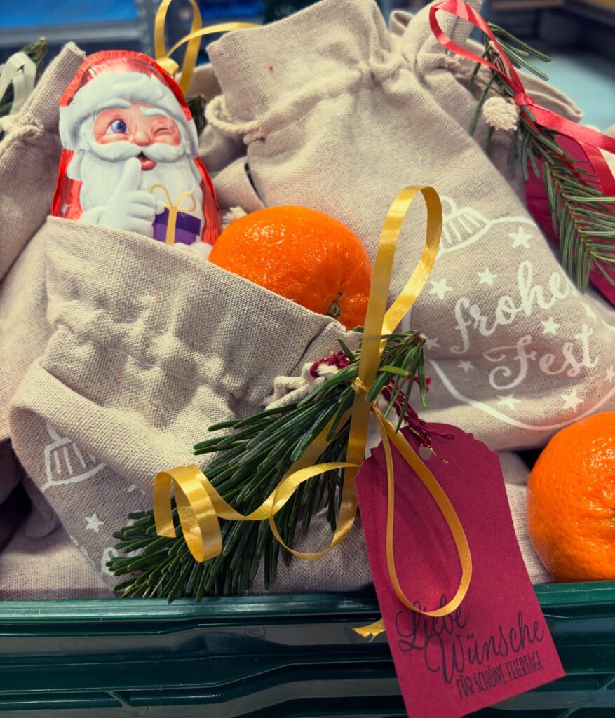 In der Woche vor Weihnachten durften wir hunderte von Weihnachtssäckchen mit Mandarinen und süßen Leckereien an unsere „Tafel-Kinder“ verteilen. Lieben